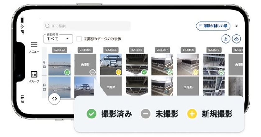 スマホで、過去の点検調書にある同じ位置の写真を表示しながら撮影することが可能です。