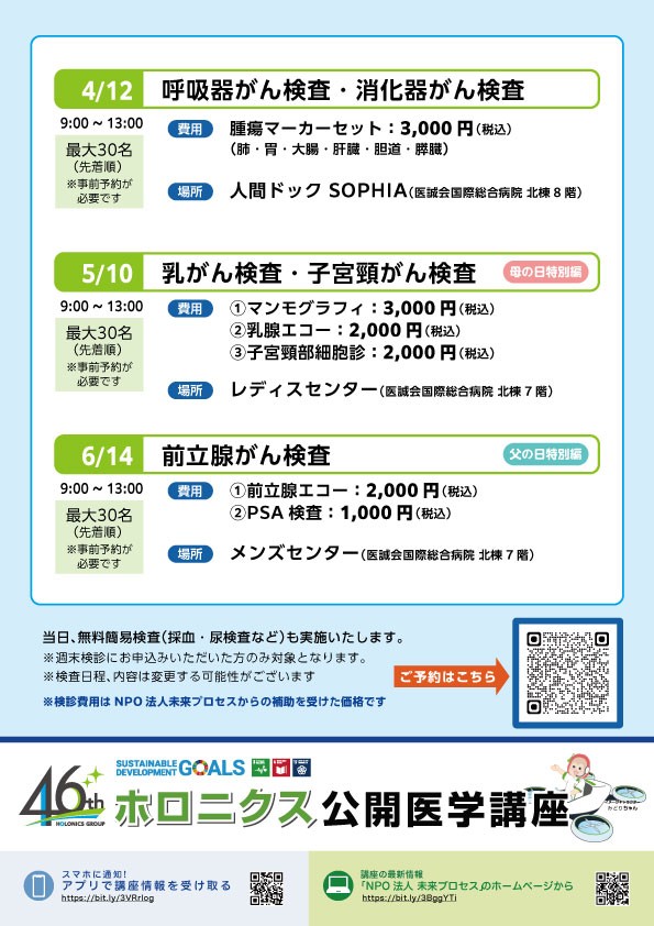 医療法人医誠会 医誠会国際総合病院(大阪府大阪市、代表者:谷 幸治)は、NPO法人未来プロセス、一般財団法人ホロニクス医学健康振興財団が共催する「週末検診」を協力開催します。4月12日(日) 9:00~13:00 「呼吸器がん検査・消化器がん検査」を定員30名で実施予定、現在予約受付中です。