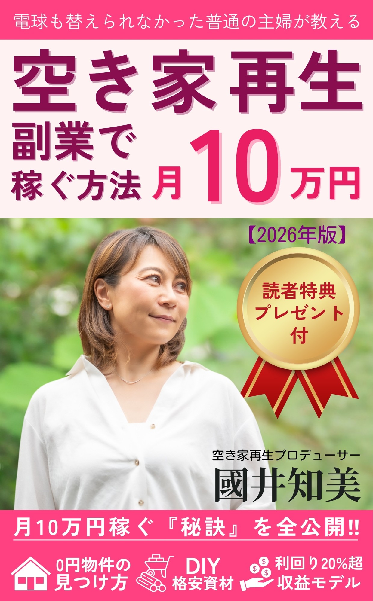 Amazon.co.jp: 空き家再生副業で月10万円稼ぐ方法【2026年版】: 電球も替えられなかった普通の主婦が教える、初心者でもできる空き家再生の秘訣を全公開 eBook : 國井 知美: Kindleストア : https://www.amazon.co.jp/dp/B0GX32NPNK
