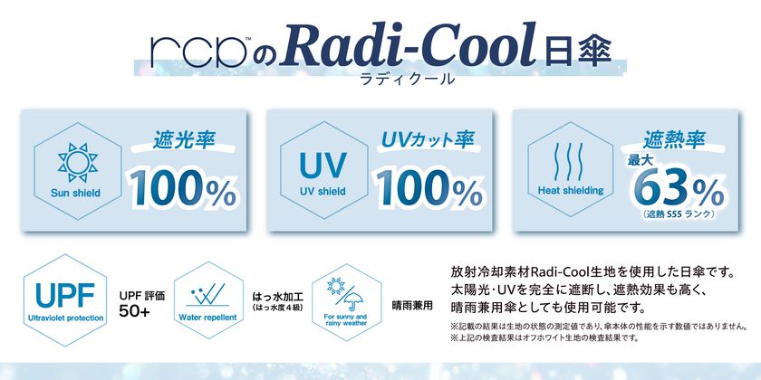 真夏の強い日差しの中でも、違いを感じる涼しさ。本シリーズは照り返しや紫外線・近赤外線から肌を守り、晴れの日も雨の日も、あらゆるシーンで活躍します。熱中症対策・日焼け対策・美容対策までカバーする『rcp(アールシーピー)』は、これからの猛暑時代に欠かせない次世代日傘です。