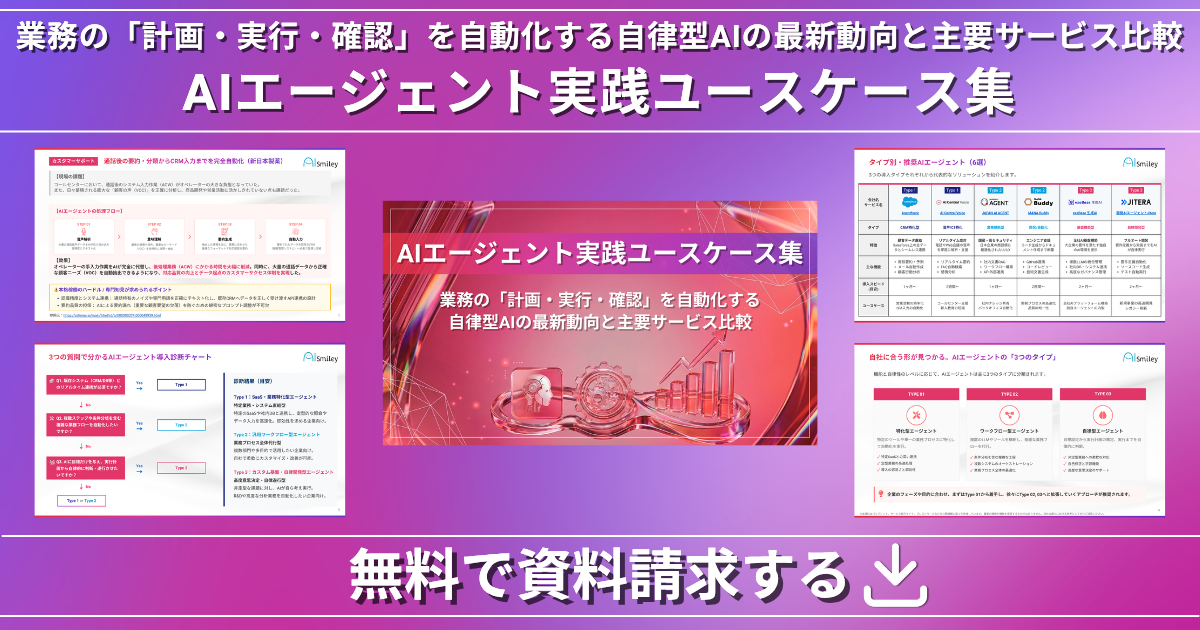 今すぐ無料で資料請求 : https://aismiley.co.jp/ai-agent-usecase-guide-inquire/