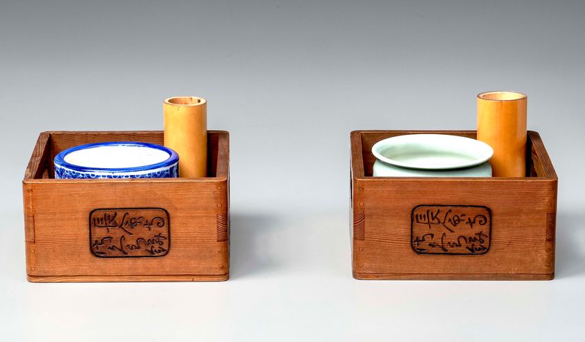 向島名物「長命寺桜餅」の焼印が入った、升形のたばこ盆。