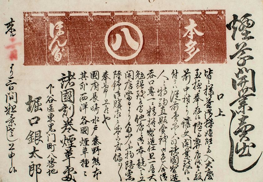 江戸時代以来たばこ店の暖簾は柿渋色だったため、たばこ店の引札であることが一目でわかる。開業にあたっての口上と、末尾には開業から3日間、記念品を進呈することが書かれている。