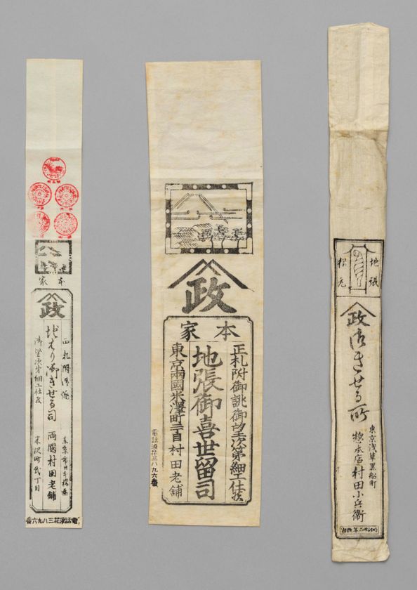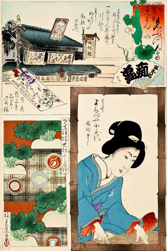 商標や屋号を摺った包紙やラベルは、商品や店の印象づけや販促効果につながります。江戸時代は木版の墨刷か、せいぜい二色刷でしたが、明治時代になると、輸出品用に他国の製品との対抗から多色刷の豪華なラベルが作られるようになり、国内品へも波及しました。緻密な描線を得意とする西洋由来の木口(こぐち)木版印刷や、引札と同じく石版印刷などが採用され、小さな画額に趣向が凝らされました。得意先に配る景物[おまけ]の紙ものは、夏は団扇(うちわ)、年始は暦や双六(すごろく)などが定番でした。