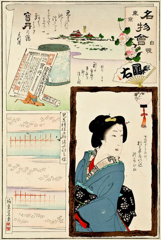(Photo_05)「東京自慢名物会 薬種化粧品問屋 せと物町 きの国や斎藤」梅素薫図案 福田熊次郎版 1896年(明治29)頃