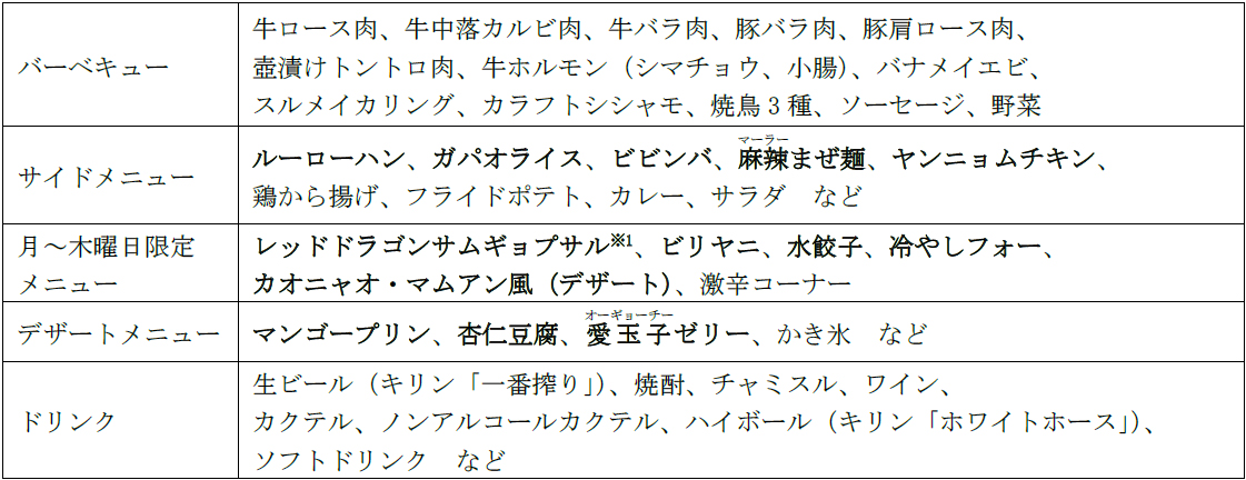 今年は時間無制限で、牛ロース肉や豚バラ肉、壺漬けトントロ肉、牛ホルモンなど8種類のお肉やシーフード、焼鳥3種類、野菜などのバーベキューメニューに加え、サイドメニューとして、台湾のルーローハンやタイのガパオライス、韓国のビビンバや中国の麻辣(マーラー)まぜ麺といったアジアンフードをご用意。