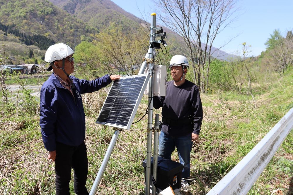 雪解けを待って行われた設置作業では、辻特担教授や轟社長らが村役場の髙島一成・産業課長と打ち合わせながら、クマの目撃件数が特に多い5カ所を選定して、単管パイプを打ち込んで電源用の太陽光パネル、高周波発生装置、スピーカーを取り付けていきました。
