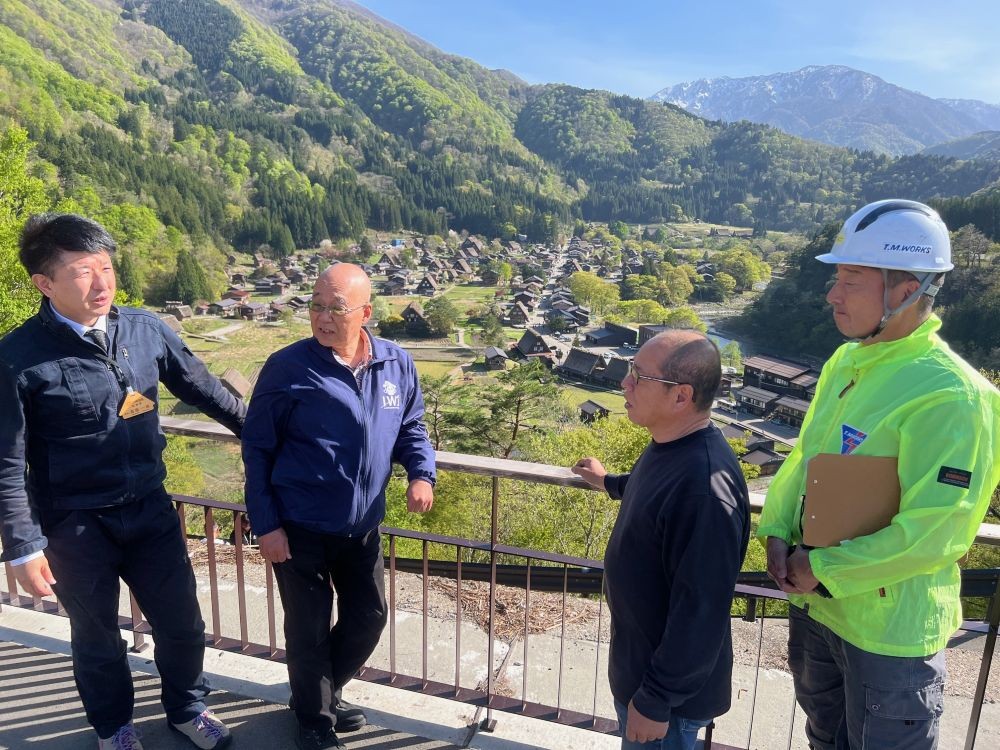 合掌造り集落の展望台で髙島課長(左端)から集落内でのクマの出現状況を聞く(その右から)辻特担教授、轟社長、渡邊さん