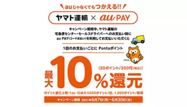 キャンペーンでは、ヤマト運輸の宅急便センター・セールスドライバーへの支払い時にau PAYを利用すると、1回の支払いごとに決済金額の10%を還元する。
