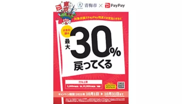 青梅市内の中規模・小規模のPayPay加盟店のうち、青梅市とPayPayが指定した対象店舗で、PayPay残高、ヤフーカード、「PayPayあと払い(一括のみ)」で支払うと、対象決済日の翌日から起算して30日後に決済額の30%のPayPayボーナスを付与する。