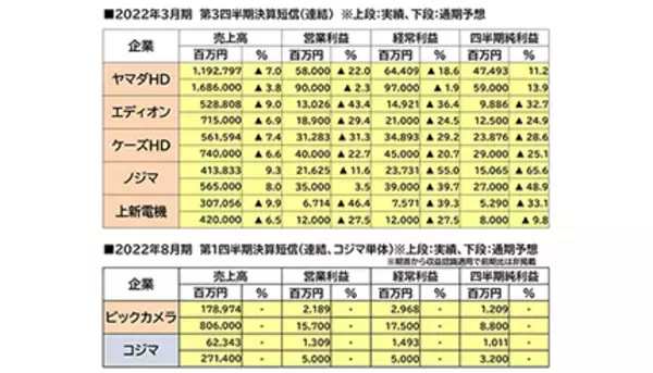 新型コロナウイルスの影響緩和のため、「特別定額給付金」と称し、給付対象者に一律10万円が給付された2021年3月期には、家電量販各社では「それを原資として家電製品を購入する」という特需が起きた。この特需の反動と夏場のエアコン販売の不調などにより、今期は一転して図のように家電量販企業は全社営業減益となっている。