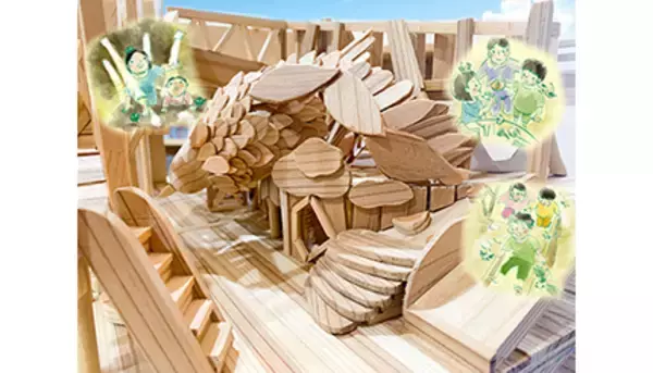 同社が家づくりに使用するのと同じ、岐阜県東白川村の材を中心とした国産無垢材のみを使っており、すべて無塗装なので万が一子どもが舐めてしまっても問題ない。メインシンボルであり、遊具でもある「モリハリプー」には、産地と生産ラインを証明する国際的認証である「FSC認証」を受けた木材のみを使用する。