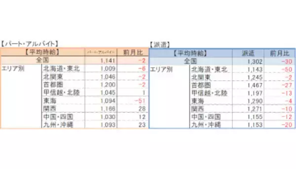 データによれば、「パート・アルバイト」における全国・全職種の平均時給は1141円で、前月比マイナス2円、前年同月比プラス41円。