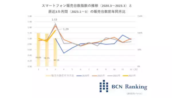 3月の販売台数は前年同月比84.5%。これは過去3年間で最も低い水準だ。とはいえ、21年1月~23年3月の月間販売台数を比較すると、22年3月、21年3月に続き、3番目に多かった。また、新型コロナウイルスの感染拡大のため、キャリアショップや家電量販店の休業・時短営業があった20年3月は上回っている。