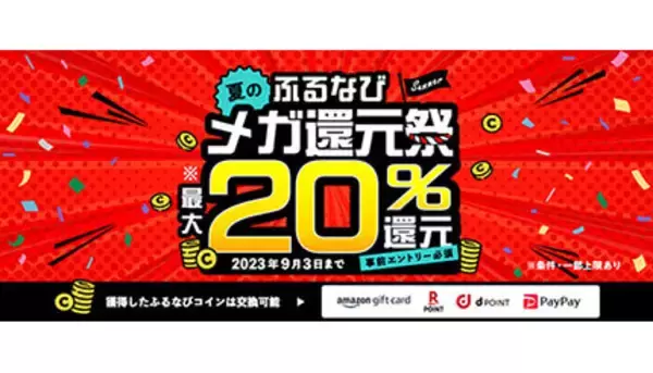 「最大15%分還元!付与上限なし!2023夏のふるなび得トクキャンペーン 事前エントリー&寄附でふるなびコインがもらえる!」では、「ふるなび」にログインまたは新規会員登録(無料)し、同キャンペーンにエントリーした上で、「ふるなび」にログインした状態のままクレジットカード決済、Amazon Pay、PayPay、楽天ペイ、d払いのいずれかで対象の返礼品に寄附をすることで、寄附金額の最大15%分のふるなびコインがもらえる。