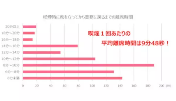 調査結果によれば、自身のデスクから最寄りの喫煙可能な場所に喫煙しにいくにあたって、席を立ってから業務に戻るまでの具体的な時間を調査し、その結果を加重平均で算出したところ、離席時間が平均9分48秒間であることが明らかになったという。