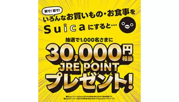 JRE POINT WEBサイトにSuica(無記名Suica、記念Suicaを除く)を登録のうえ、キャンペーン期間中に専用ページからエントリーを行い、参加条件の1・2の両方を達成した人から抽選で1000人にJRE POINT 3万ポイントをプレゼントする。