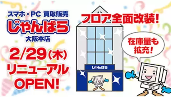 「じゃんぱら大阪本店」は、店内改装のため2月7日から一時閉店しており、今回のリニューアルではフロアの全面改装によってこれまで以上にキレイで明るい店舗へと生まれ変わるとともに、改装前を凌ぐ豊富な商品ラインアップを取り揃えて来店客を迎える。
