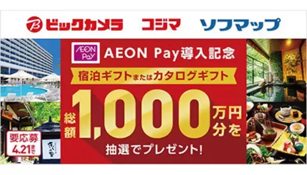 「AEON Payキャンペーン」では、2月28日から4月10日までの期間中、ビックカメラ、コジマ、ソフマップ店舗でAEON Payのスマホ決済(チャージ払いは対象外)を利用し、5000円を1口として応募すると、抽選で100組200人に5万円相当のペア宿泊ギフトをプレゼントする。さらに、抽選に漏れた人の中からWチャンスとして、抽選で1000人に5000円相当のカタログギフトをプレゼントする。応募期間は4月21日まで。