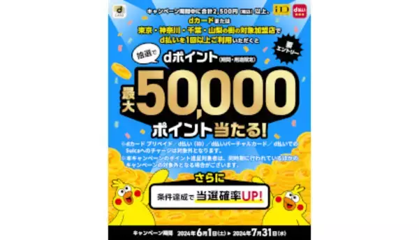 当選ポイント数と当選人数は、1等5万ポイント(50人)、2等3万ポイント(100人)、3等1万ポイント(200人)、4等1000ポイント(5000人)、5等200ポイント(1万人)。さらに、支払方法を「dカード」に設定した「d払い」で1回以上支払うなど指定の条件を満たすと当選確率は最大12倍にアップする。