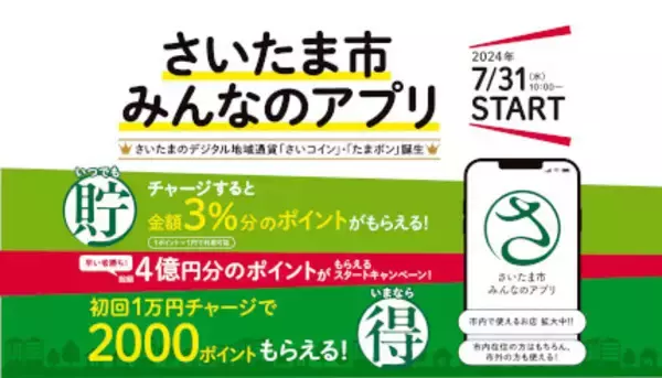 デジタル地域通貨については、2024年度中はチャージ金額の3%分の「たまポン」がもらえるほか、先着順で、初回1万円以上をチャージすると2000円分のポイントを進呈するスタートキャンペーンを実施する。予算総額は4億円で上限に達し次第終了。独自ポイントの「たまポン」は1ポイント1円として利用可能で、有効期限は、最終付与・利用から180日間。サービス開始時点の「さいコイン」へのチャージ方法は銀行口座、クレジットカード(イオンカード)のみ(1回1000円以上・上限4万9000円)。また、チャージにあたり、氏名などの利用者情報とマイナンバーカードの認証が必要。