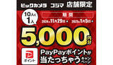 ビックカメラグループのビックカメラとコジマは11月29日~2025年1月5日の期間、店舗限定でコード決済を使って1000円以上購入すると、抽選で10人に1人、5000円分のPayPayポイントが当たる...