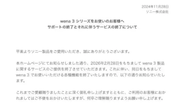 26年2月28日をもって終了するソニーが提供するサービスは、修理窓口による受付、wena 3 アプリへのログイン、アプリのダウンロード・更新、アプリ内の天気設定など。アカウント情報はサービス終了とともに削除する。他社連携サービスは、交通系ICカード機能(Suica)、MAMORIO機能、Riiiver機能、ヘッド連携機能、Alexa 連携機能、Google Fit 連携機能、Apple ヘルスケア連携機能。なお、Suica新規発行機能は25年11月25日に停止する。
