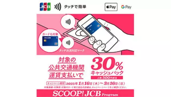 ジェーシービー(JCB)は、タッチ決済対応マークのあるJCBカードまたは同カードが設定されたスマートフォン(スマホ)などで対象の公共交通機関に乗車すると、もれなく利用合計金額の30%をキャッシュバックする「JCBのタッチ決済で公共交通機関に乗ろう!30%キャッシュバックキャンペーン」を実施している。キャンペーン期間は1月16日から3月16日まで。