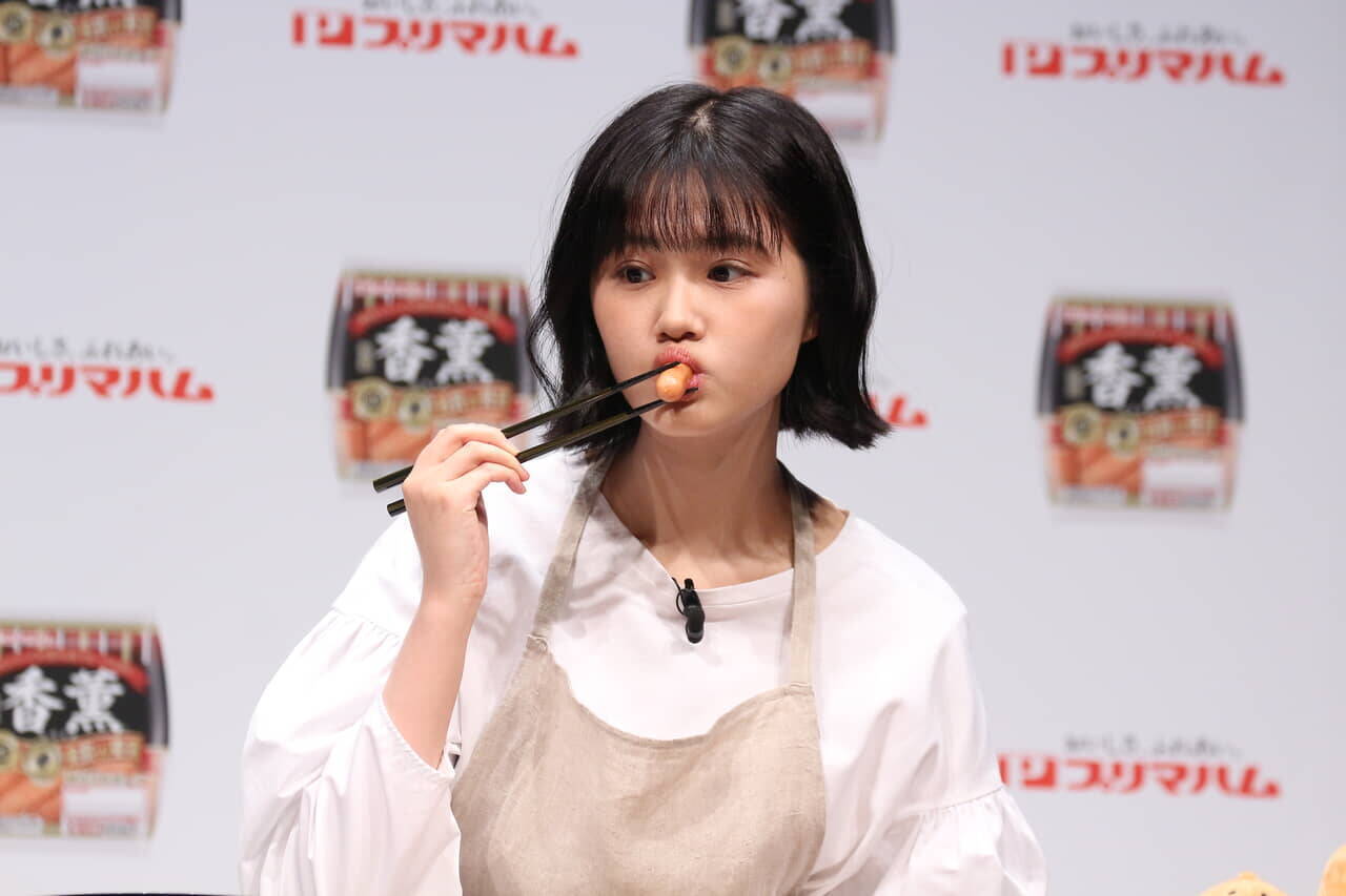 続いて、プリマハム公式サイトで紹介されている「王道炒め」に原が挑戦する調理企画が行われた。普段あまり料理をしないという原は、「朝から焼くだけでこんなに美味しいご飯が食べられるのは嬉しい。私のように不器用な方でも、これなら簡単に挑戦できそう。朝食だけでなく、お弁当に入れてピクニックに持って行くのも楽しそう」とコメントしながら手を動かした。