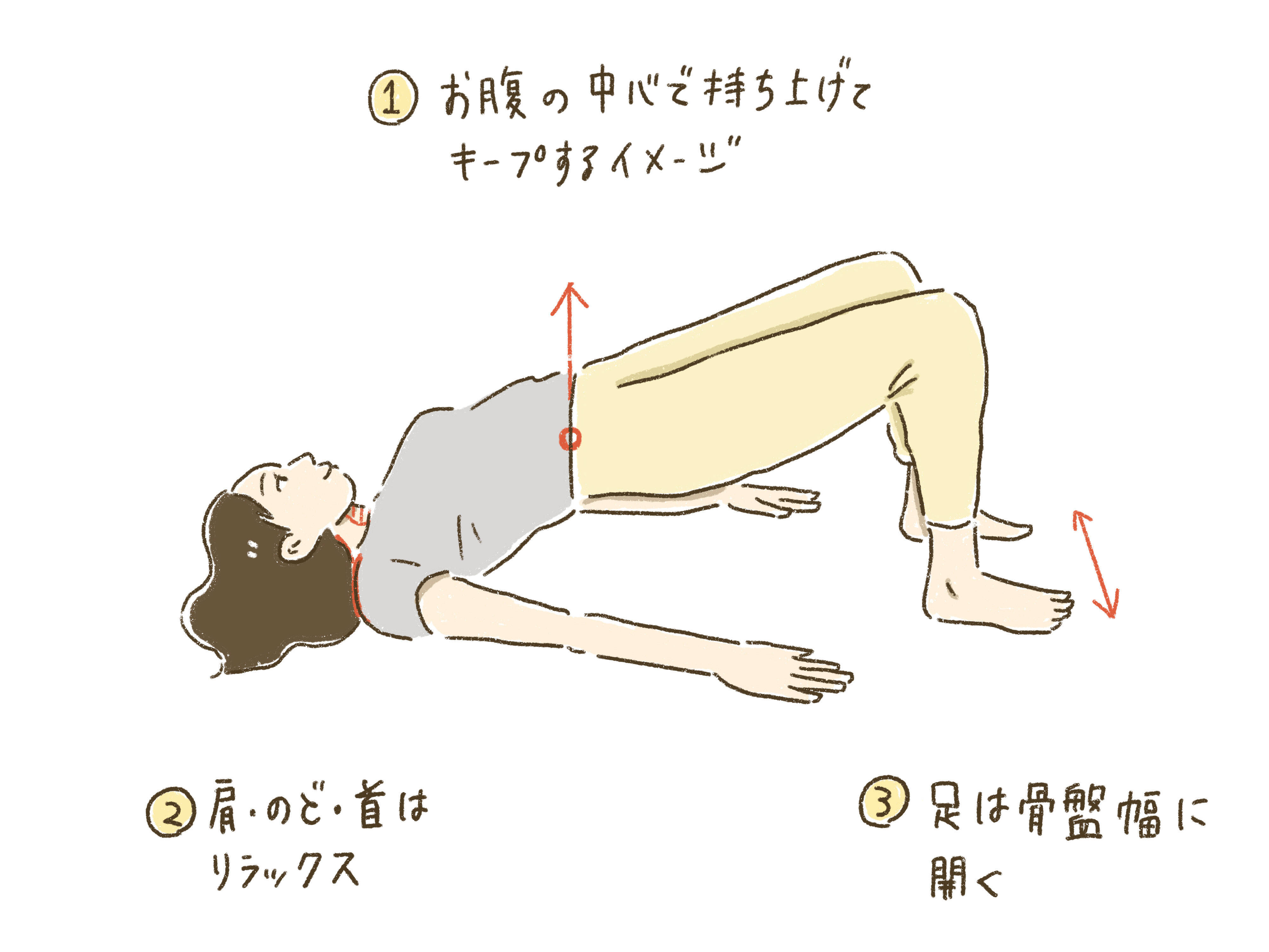 ①仰向けに寝て膝を立て、足は骨盤幅に開く。②腰を持ち上げて膝から肩までを一直線にしてキープする。