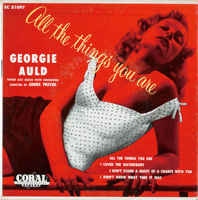 たとえばジョージー・オールドのシングル盤「all the things you are」は、燃えるような真っ赤な地に女性のけだるいポーズ。上衣だけ白くして目立たせているが、この目立たせ方は、左の肩紐が落ちていることを視認させるのにも効果を発揮している。