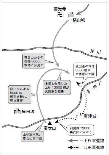 この時、上杉軍の兵数は武田軍より六割も上回っていたが、春日山からの増援と合流した数であろう。この時の上杉軍が用いた陣形は「車懸がり」であったと伝わる。