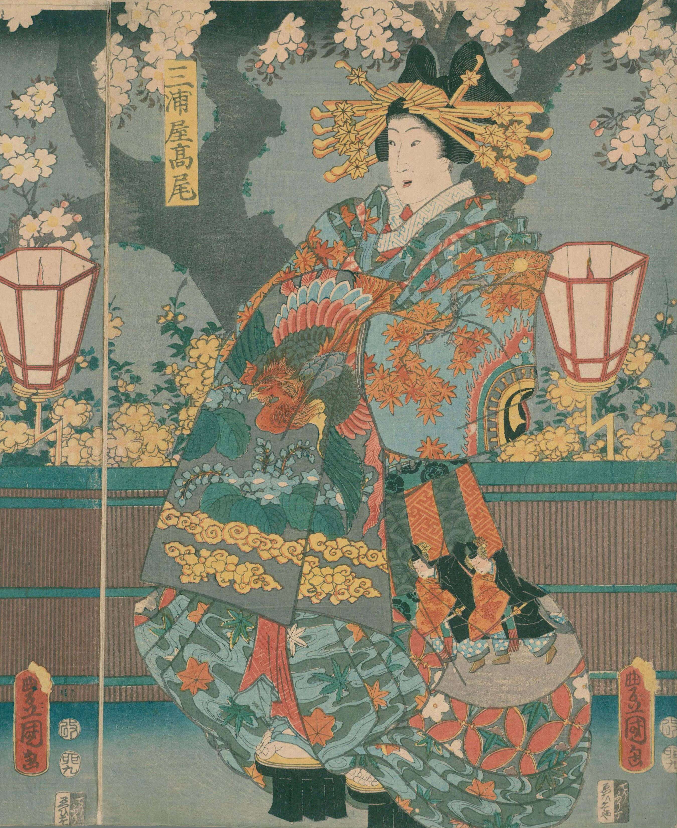 三浦屋は吉原でも超一流の妓楼だった。その三浦屋で代々継承された太夫の名称が高尾で、七代までいたとも、十一代までいたともいわれる。図1の高尾が何代目かは不明。ともあれ、図1を見ると、