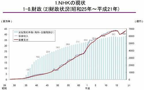 1950年から2009年までの財政状況をグラフ化したものを見れば、一目瞭然だ。受信契約件数はあまり伸びていないにもかかわらず、事業収入は89年(平成1年)以降、大幅に増えていった。4000億円程度だった収入が、91年には5135億円になり、97年には6117億円となったのだ。BSの受信契約者は順調に伸びてきたのだ。