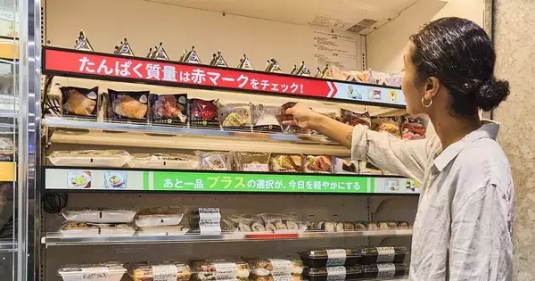 一般的なコンビニと異なるのが、天井や陳列棚の上にAIカメラを搭載し、陳列棚には細長いカラー表示パネルを搭載していること。防犯カメラを兼ねたAIカメラで来店者の年齢層や性別を判別したうえで、陳列棚の前での動きを分析。長く弁当コーナーの前で立ち止まっていれば「お弁当選びで悩んでいる」と判断し、現在の売れ筋ランキングや新商品などの情報をパネルに表示して購買を促してくれる。お弁当やおにぎりを棚から取った場合は、栄養の偏りを補助できるお惣菜や、おすすめの飲料をパネルに表示する。