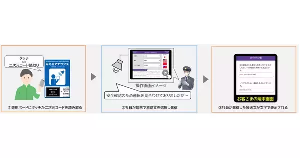 駅構内の専用ボードにタッチするか二次元コードを読み取ると、「みえるアナウンス」の画面に駅の放送案内の内容が文字で表示される。案内の内容は駅員が端末から選択した定型放送文となる。最大13言語に対応可能だが、今回の試行では4言語(日本語・英語・中国語・韓国語)に絞って試行する。