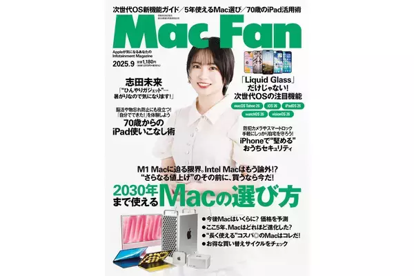 マイナビ出版は7月29日、Apple専門誌『Mac Fan』2025年9月号を発売した。第1特集「2030年まで使えるMac選び」、第2特集「70歳からのiPad使いこなし術」、第3特集「iPhoneで"堅める"おうちセキュリティ」などがラインナップされている。