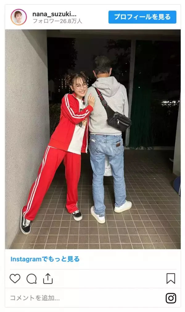 鈴木が「昨日は大好きな父が車で仕事現場に迎えに来てくれました」というコメントとともに投稿したのは、父親との2ショット。写真には赤いセットアップのジャージを着た鈴木と、ジーンズにパーカーで背中を向ける父親が並ぶ姿が収められている。