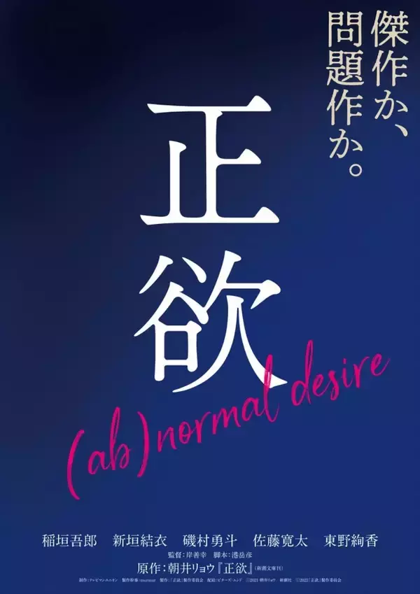 今回解禁されたティザービジュアルでは、『正欲』というタイトルが大きく示されており、「(ab)normal desire」という映画『正欲』の英題がパッションピンク色の手書き風文字で強調されている。あえて括弧でくくられた「ab」が意味するものとは何なのか…気になるビジュアルになっている。
