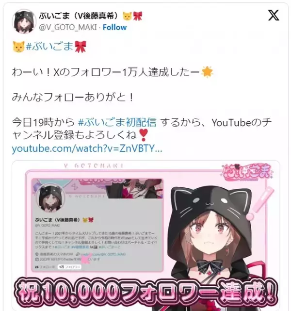 そんな「ぶいごま」のエックスが26日に更新され「わーい!Xのフォロワー1万人達成したー みんなフォローありがと!今日19時から #ぶいごま初配信 するから、YouTubeのチャンネル登録もよろしくね」と、フォロワー1万人突破を発表した。