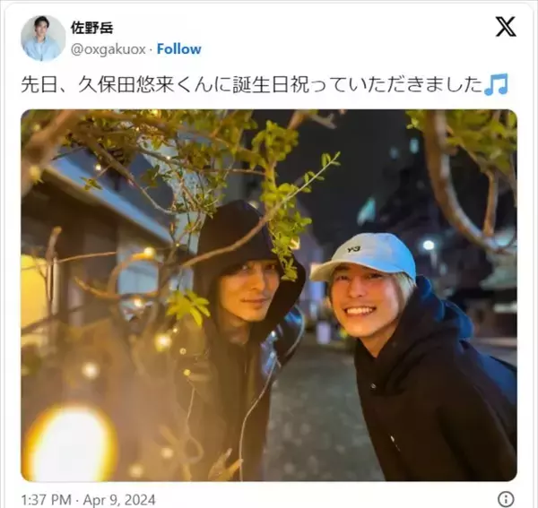 佐野が「先日、久保田悠来くんに誕生日祝っていただきました」とし公開したのは俳優・久保田悠来との2ショット。2人は『仮面ライダー鎧武/ガイム』で共演しており、佐野が主人公・葛葉紘汰/アーマードライダー鎧武を、久保田は呉島貴虎/アーマードライダー斬月を演じた。