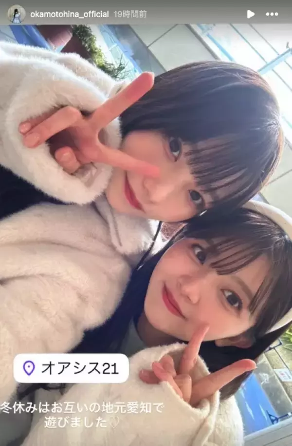 投稿で岡本は「冬休みはお互いの地元愛知で遊びました」とつづり、山下と共にピースサインを見せる2ショットを掲載。2人は共に愛知県出身で、同じ2003年生まれの21歳。乃木坂46、櫻坂46、日向坂46からなる「坂道グループ」に所属している。