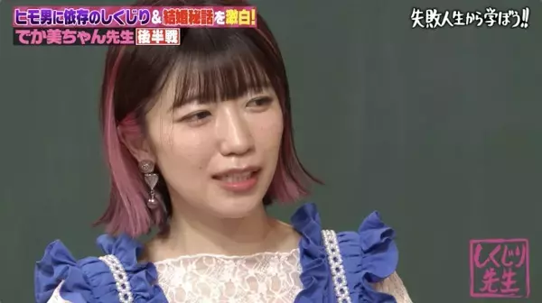 番組前半では、“売れてない劇団の演出家”だった2人目のヒモ男と、“売れてないロックバンドのベーシスト”だった3人目のヒモ男とのトラウマとも言える交際期間を赤裸々に告白。でか美ちゃんは、「売れることが必ずしも正解じゃない」と夢を語っていた2人目のヒモ男に「かっこいい! あなたの才能に世間が追いつきますように!」と心酔していた過去や、蔑ろにされ続けて幸せの価値観が麻痺した結果、3人目のヒモ男から「誕生日に98円の紙パックミルクティーをプレゼントされ、うれしすぎて号泣した」というしくじりエピソードを明かし、教室を驚かせた。
