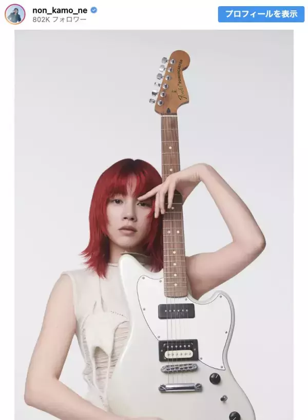 のんが投稿したのは、白のギターを抱えたソロショット。ニット素材のドレスに赤髪を合わせた姿で、クールな表情をカメラに向けている。この写真は、自身3枚目となるフルアルバム『Renarrate』の発売発表とあわせて披露されたものだ。