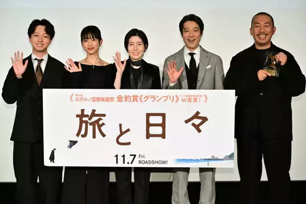 映画『旅と日々』のジャパンプレミアが、10月22日に行われ、主演のシム・ウンギョン、共演の堤真一、河合優実、高田万作、三宅唱監督が登壇。三宅監督作品への出演経緯、そして映画の見どころについて語ったほか、ロカルノ国際映画祭の最高賞となる金豹賞のトロフィーも披露され、受賞時のエピソードも明かされた。