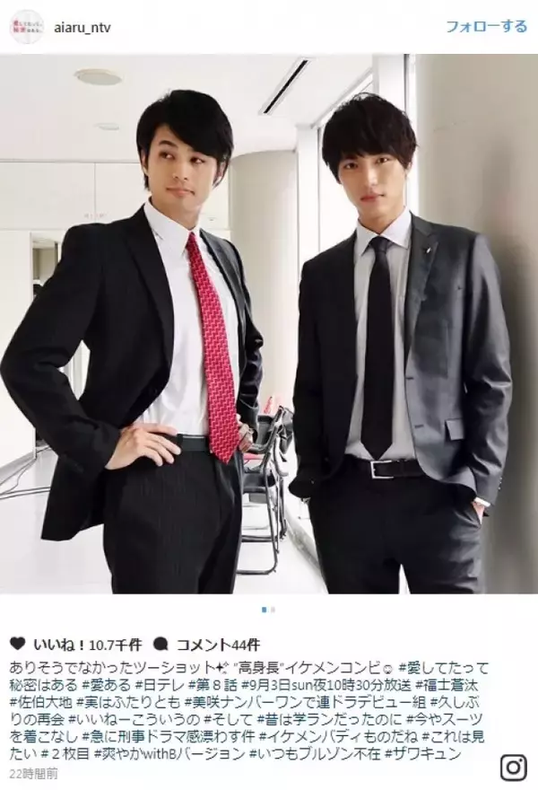 公開された写真は、ビシッとしたスーツで決めた福士と佐伯が凛々しい表情で立っているものと笑顔で“ブルゾンポーズ”をとっているものの2枚。共に180cm以上の身長の2人が並ぶ姿の写真には「ありそうでなかったツーショット “高身長”イケメンコンビ」とのコメントが綴られている。
