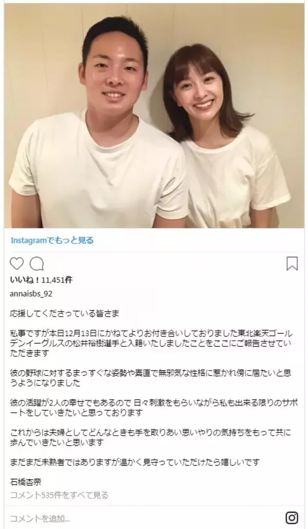 根っからの野球好きで知られる石橋は、インスタグラムで「彼の野球に対するまっすぐな姿勢や素直で無邪気な性格に惹かれ傍に居たいと思うようになりました」「彼の活躍が2人の幸せでもあるので 日々刺激をもらいながら私も出来る限りのサポートをしていきたいと思っております」と、松井投手への思いをつづり、「これからは夫婦としてどんなときも手を取りあい思いやりの気持ちをもって共に歩んでいきたいと思います」と抱負を語っている。