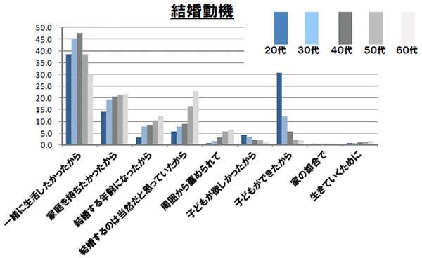「結婚動機」を聞いたところ、20~60代まで、どの年代でもトップだったのは「一緒に生活したかったから」。しかし、2位以下の項目で大きな差が出た。