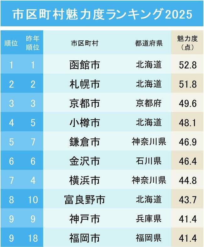 2025年の市区町村ランキングは、1位は函館市(52.8点)、2位は札幌市(51.8点)、3位が京都市(49.6点)となり、2年連続で函館市が1位に輝いた。