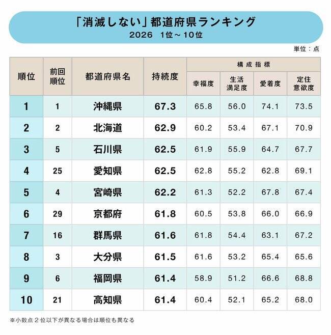 今回は、この「持続度」に基づいて都道府県に順位をつけた「消滅しない都道府県ランキング2026」を紹介する。